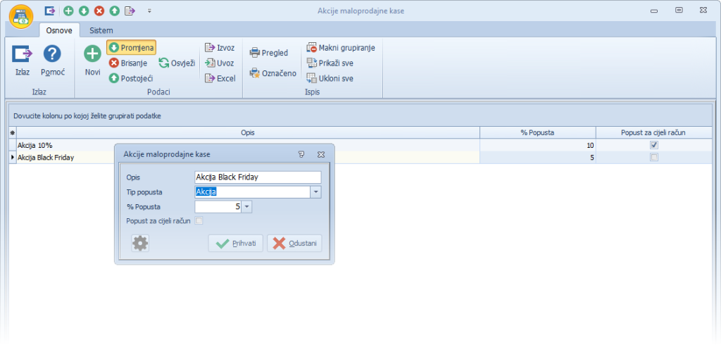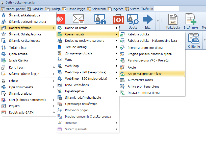 Matični podaci > Dodatni šifrarnici > Cijene i rabati > Akcije maloprodajne kase