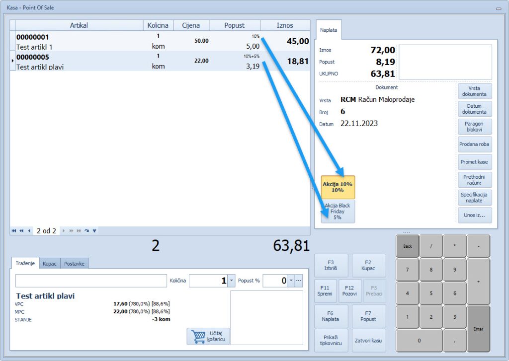 Ovdje smo za “Akcija 10%” odredili da će biti Popust i ići na cijeli dokument, dok će “Akcija Black Friday” biti Akcija samo po artiklu