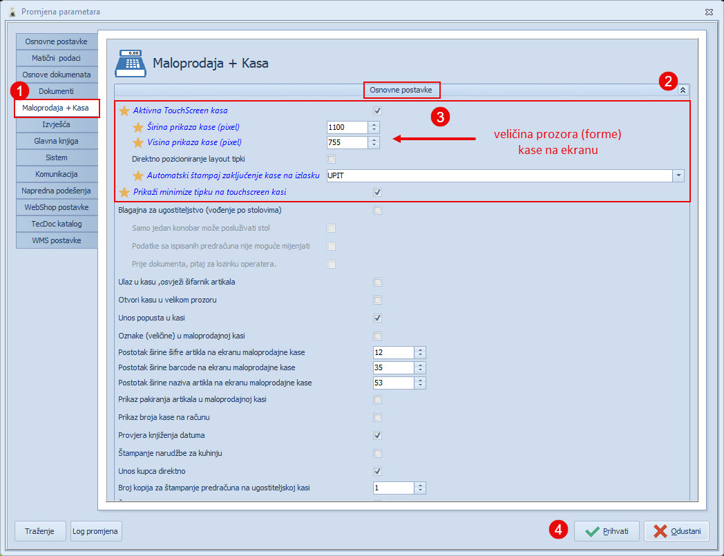 može se staviti kvačica i na minimize kako bi se mogla “spustiti” forma kase (da se ne mora svaki put gasiti i paliti). Veličinu prozora također možete po potrebi podesiti.