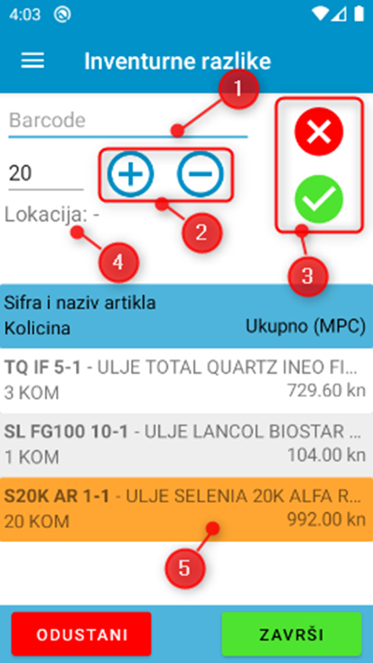 - X je za brisanje odabranog artikla, kvacica za potvrdu promjena