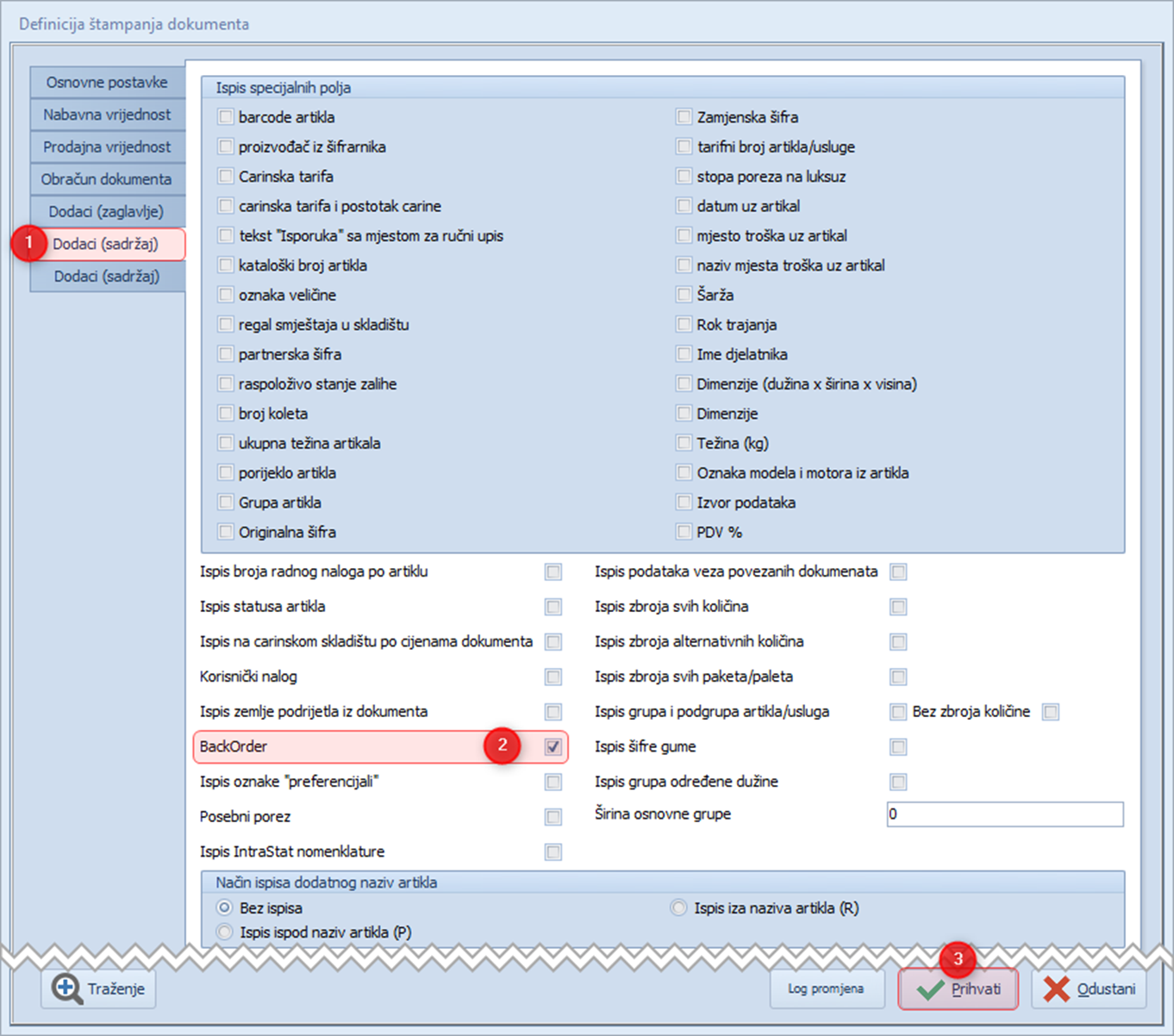 Podešavanje definicije ispisa Backorder-a na dokumentima #