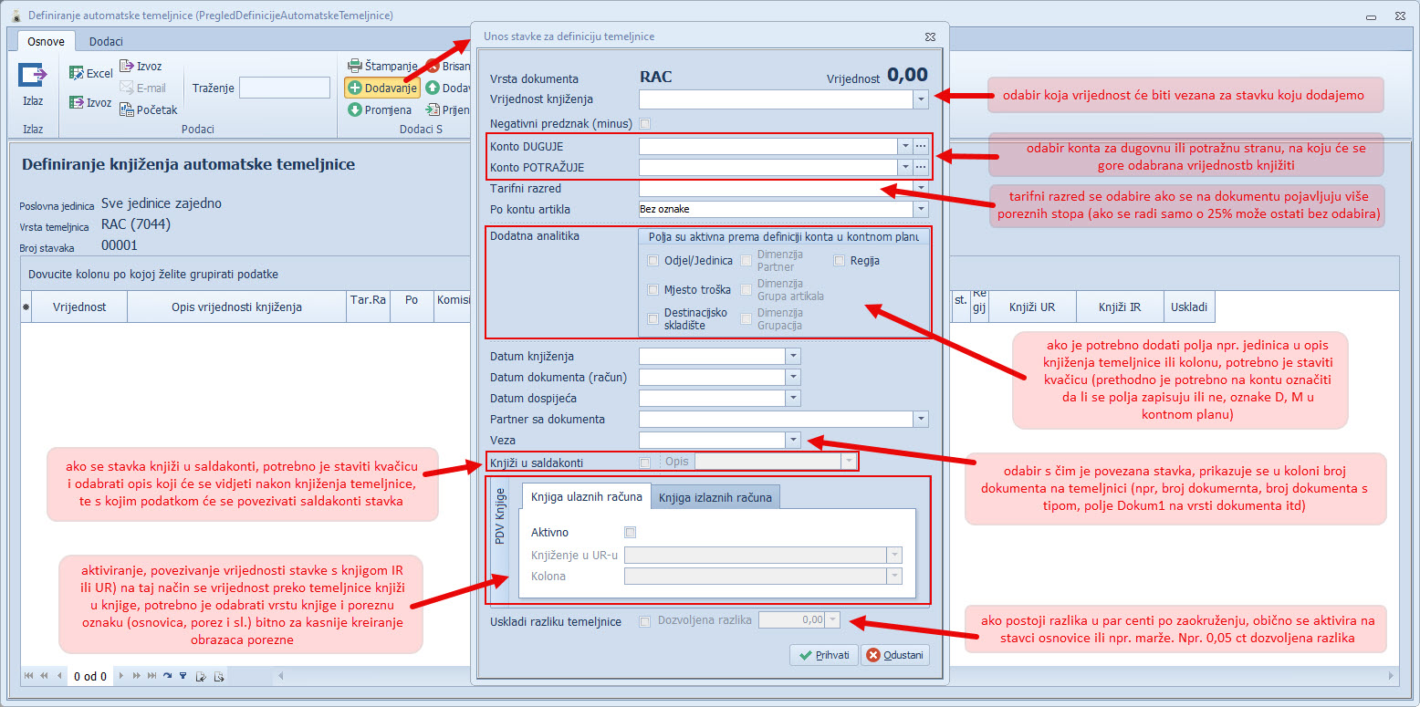 Nakon što kliknete Da popjavit će se forma za definiranje stavaka automatske temeljnice (prazna forma, znači da nije ništa definirano još). Preko tipke Dodavanje pojavit će se forma gdje se definira stavka za pojedinu vrijednost koja će se knjižiti na konto.