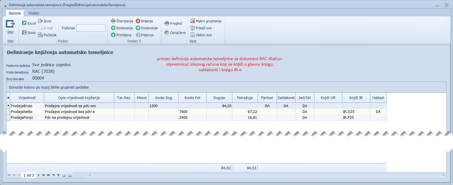 Primjer definirane automatske temeljnice sa tri stavke za vrstu dokumenta RAC s knjiženjem vrijednosti na konto 1200, 7600, 2400, knjiženje osnovice i poreza u knjigu IR, te knjiženje bruto iznosa u saldakonti.