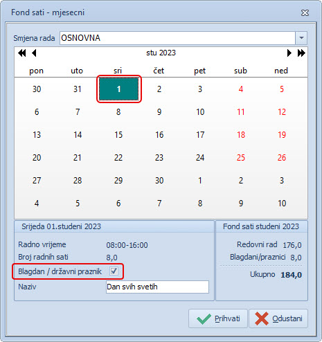 Označite željeni dan , stavite kvačicu na Blagdan/državni praznik – upišete naziv i prihvatite. U unosu evidancije označeni dan vodit će se pod Nedjelja ili blagdan.