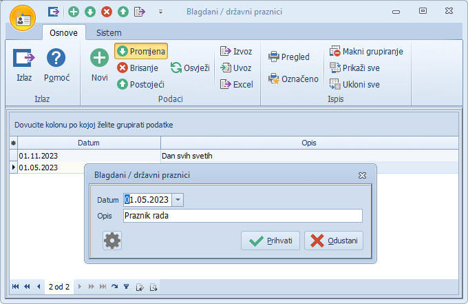 Blagdane i praznike možete unijeti i za cijelu tekuću godinu: