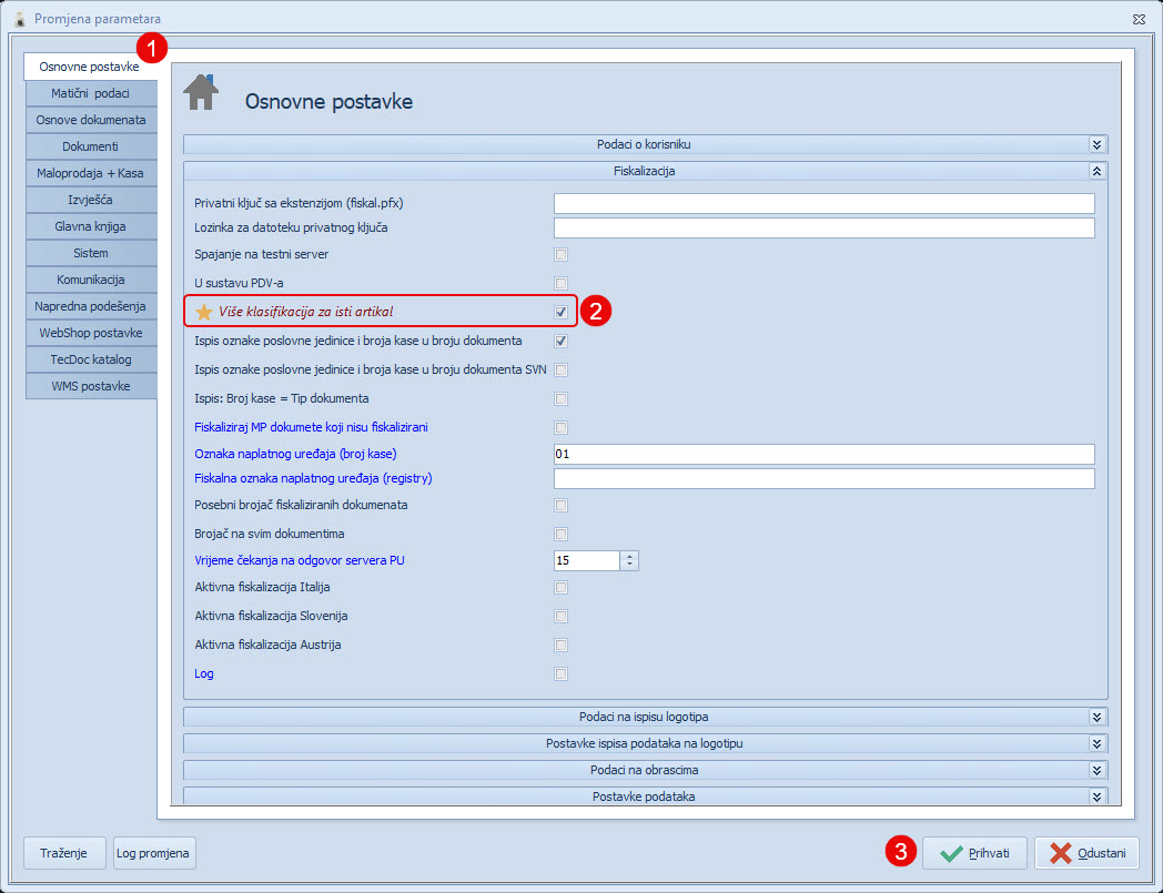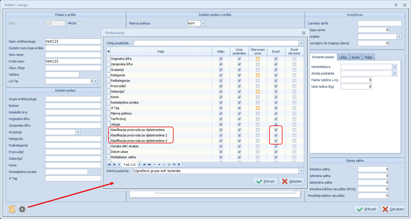 Kako bi polja klasifikacija bila vidljiva na promjeni artikla potrebno je prije svega podesiti parametar u glavnim parametrima kao na slici: