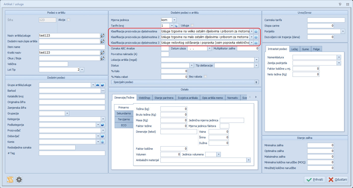 Nakon podešenog parametra pojavit će se polja klasifikacija na promjeni artikla: