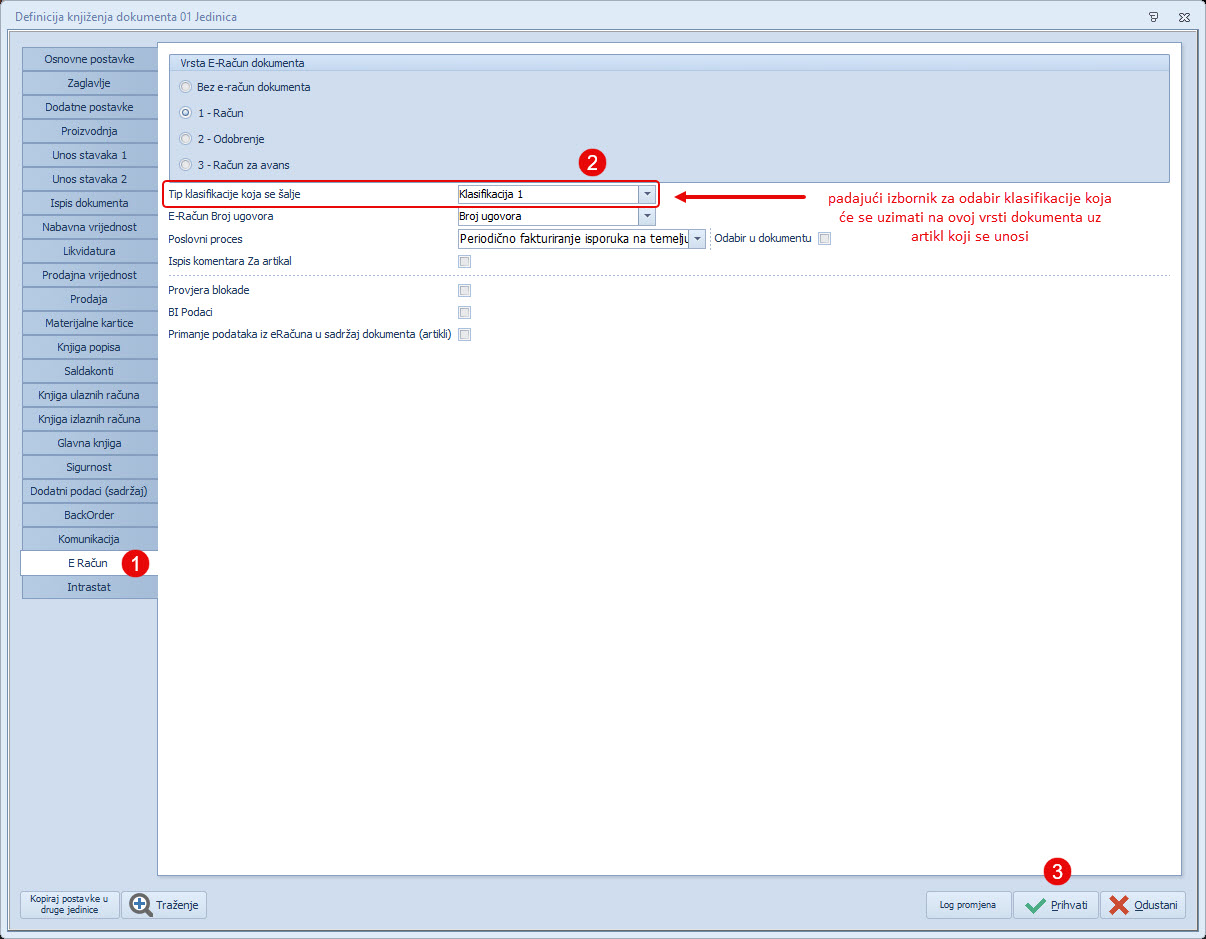 Kako ne bi dolazilo do problema sa slanjem dokumenta u sustav e-računa sad je ugrađena i kontrola da li postoji povezana klasifikacija na artiklu, od 01.01.2026 ako artikl nema klasifikaciju, neće se moći proknjižiti dokument dok se ne poveže pripadajuća šifra klasifikacije, tako da ne bi dokument bez klasifikacije otišao na centralnu platformu e-računa.