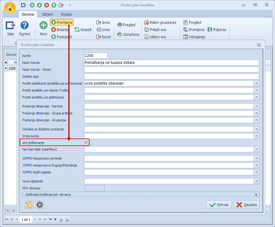 prije svega je potrebno na potražnom kontu (1200), kroz kontni plan, uključiti eIzvještavanje.