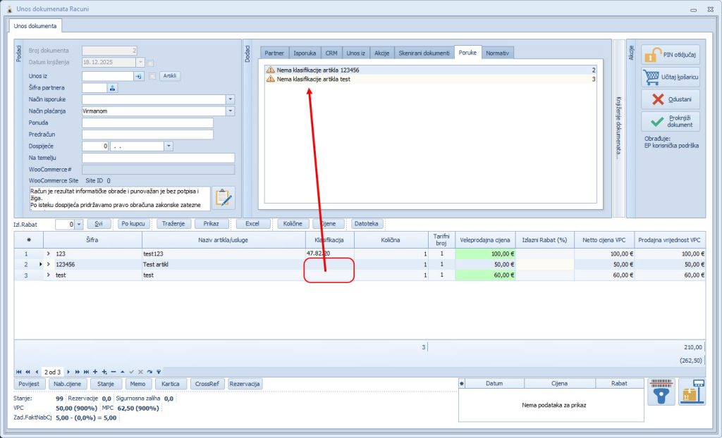 Ako nije povezana klasifikacija na artiklu kod unosa će se pojaviti poruka da nedostaje klasifikacija kao na slici: