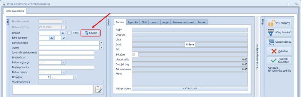Nakon podešenja će se kod unos pojaviti tipka Eračun: