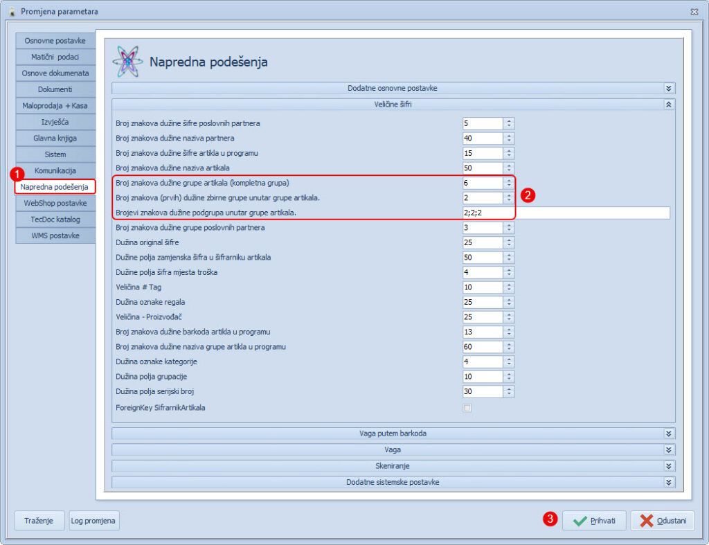 Prije kreiranja grupa artikala potrebno je podesiti ukupnu dužinu šifre (broj znakova) grupa artikala unutar parametara. Primjer na slici niže je ukupna dužina 6 znakova i podgrupe 2;2;2.