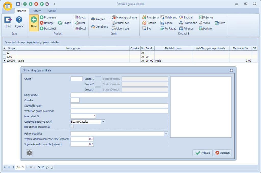 Šifrarnik grupa artikala na formi unosa nove grupe pokazuje 3 grupe (kako je podešeno u parametrima).