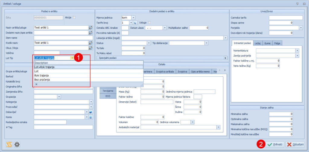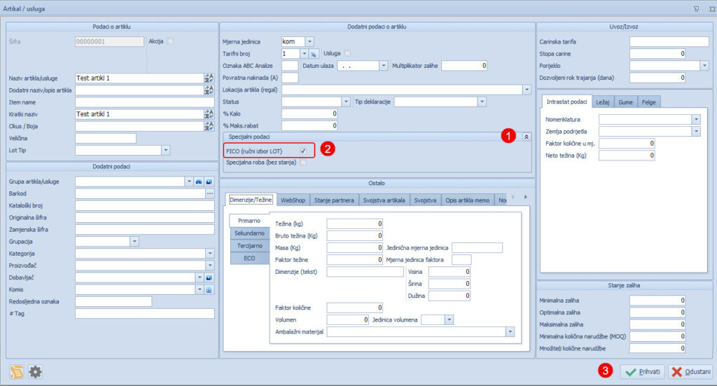 Zatim na svim artiklima za koje ćete voditi šaržu potrebno je uključiti opciju FICO (FirstIn-ChoiceOut)