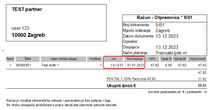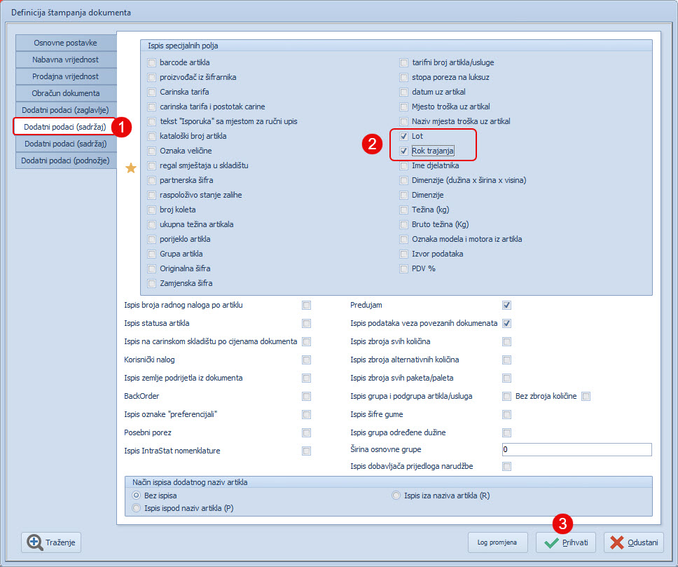 Slijedeći korak je podešenje definicije ispisa lot-a i roka trajanja na dokumentima.