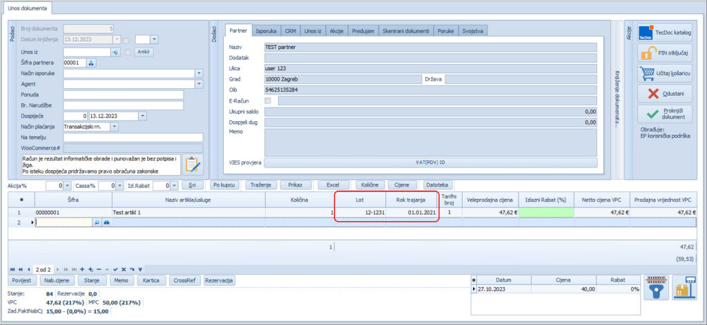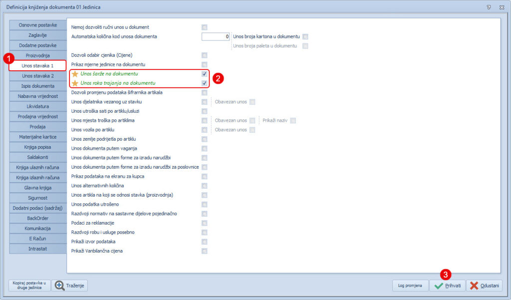 Nakon parametara i šifrarnika artikala, potrebno je na svim dokumentima ulaznim i izlaznim podesiti definiciju knjiženja dokumenta i uključiti šaržu i rok trajanja (opcija).