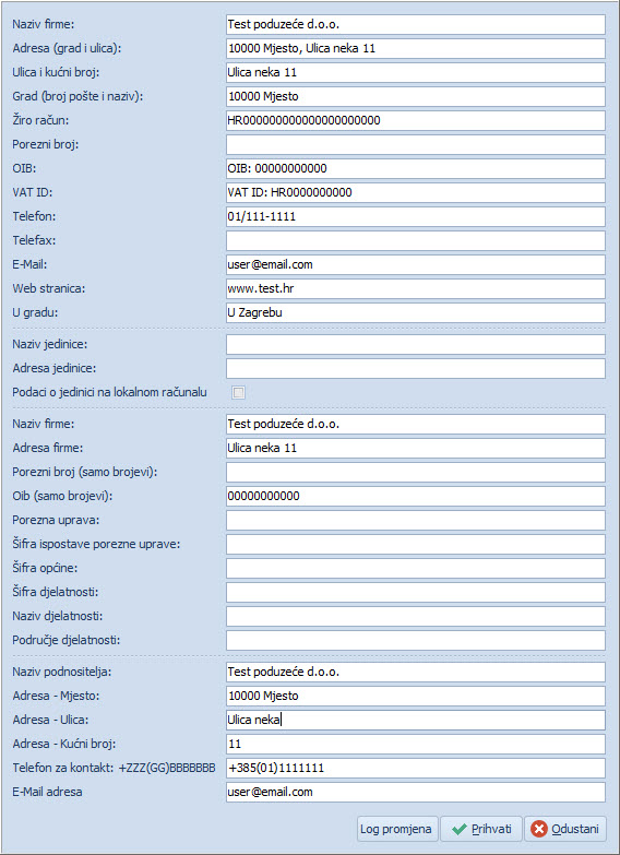 Primjer test podataka kako se unose podaci poduzeća: