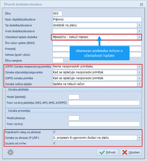 Ukoliko postoje i drugi dodatci ili obustave, dodajete ih također unutar šifrarnika dodataka i obustava.